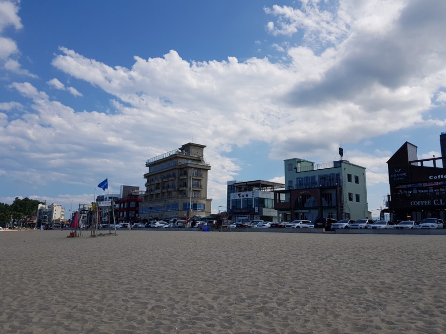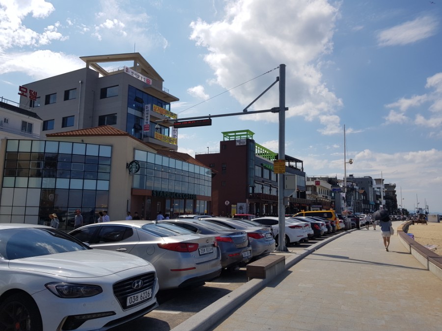오른쪽에는 해변이 왼쪽에는 카페에 늘어서 있다.