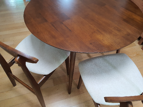 아이들과 공부하기도 좋은 것 같고, 전에는 화이트 가구가 예뻐보였는데 요즘에는 이렇게 진한 원목의 색을 가진 가구가 더 예뻐보입니다. 지름은 1m라 넓어서 좋고, 테이블 높이가 높은 느낌이 들어 마음에 듭니다. 좋은 가격에 잘 산거 같습니다.