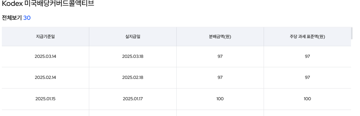 Kodex 미국배당커버드콜액티브 상장 이후 월 배당을 지급하고 있어요. 25년 올해 배당 내역은 아래와 같아요.